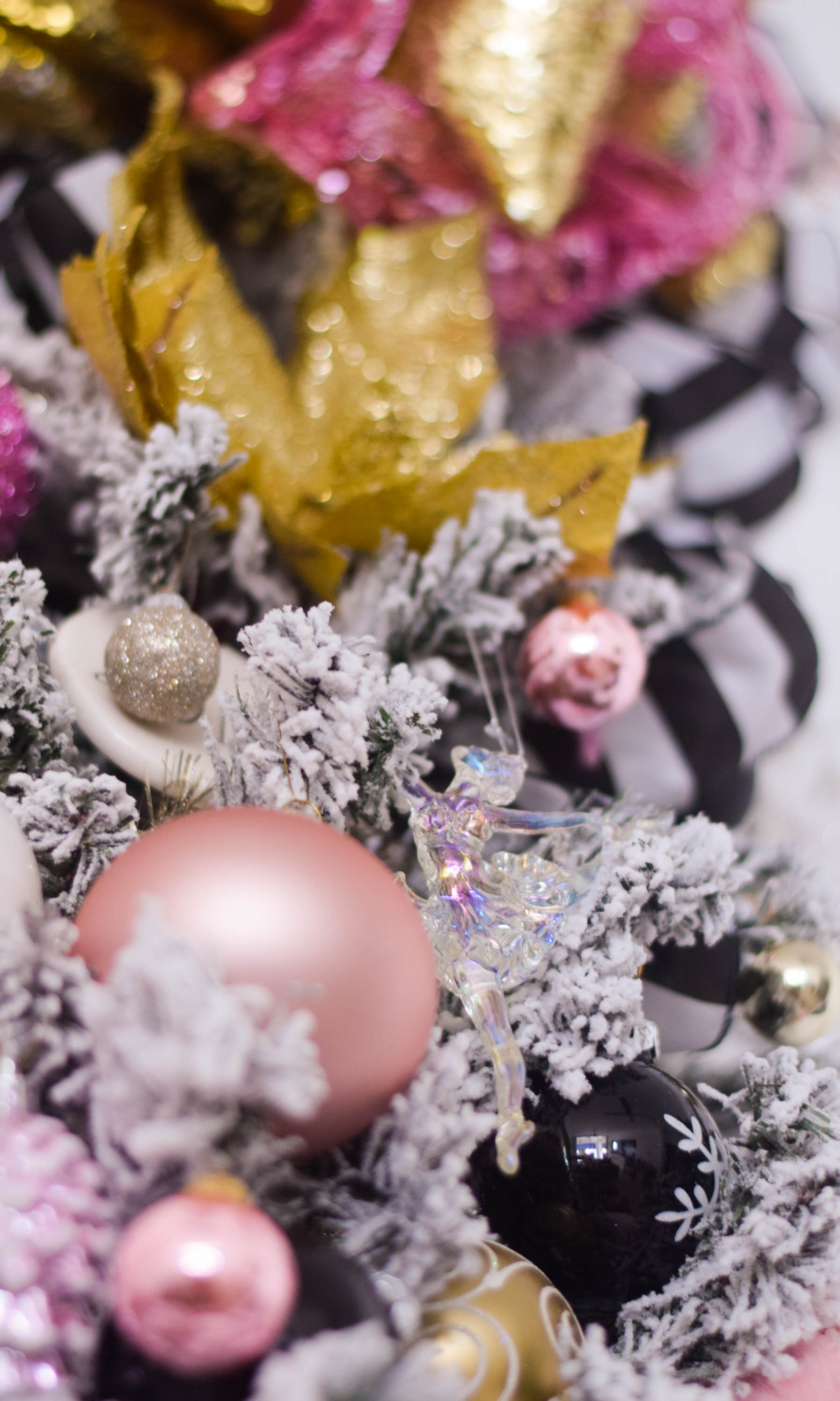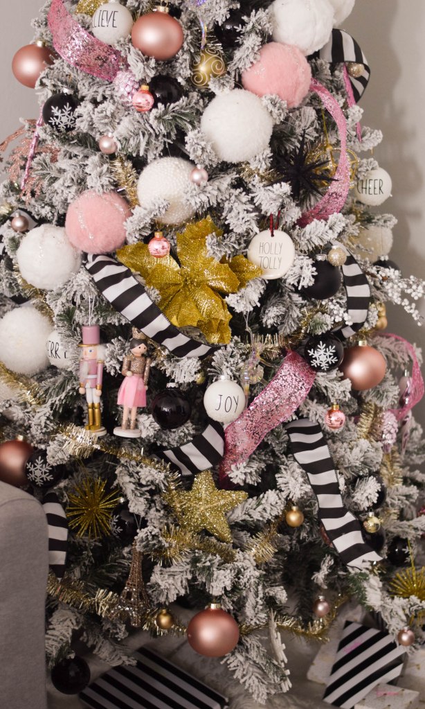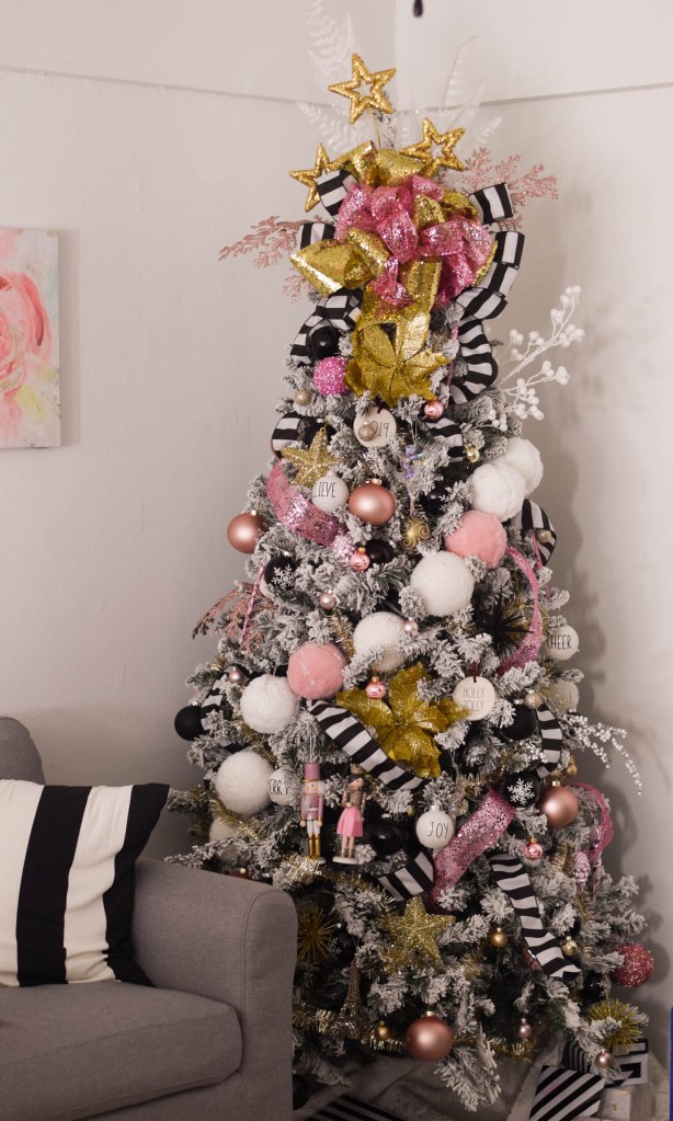 Para darle un poco de background, la decoración del apartamento la había centrado en colores básicos como gris y blanco, y los detalles de la decoración eran rosa. Pues lo mismo quise hacer con el árbol. Quería que tuviera rosa, pero no que fuera solo rosa, así que compre decoraciones rosa, blanco, negro y dorado. Algunos ornamentos eran de un rosa mas elevado, otros más pálido, pero eso es parte del efecto de no comprar todo el mismo día ni en el mismo lugar. Debo decirles que estuve meses buscando inspiración en Pinterest (aquí les dejo mi board de navidad) y en varias ocasiones visite establecimientos para ver las opciones de decoración que tenían.